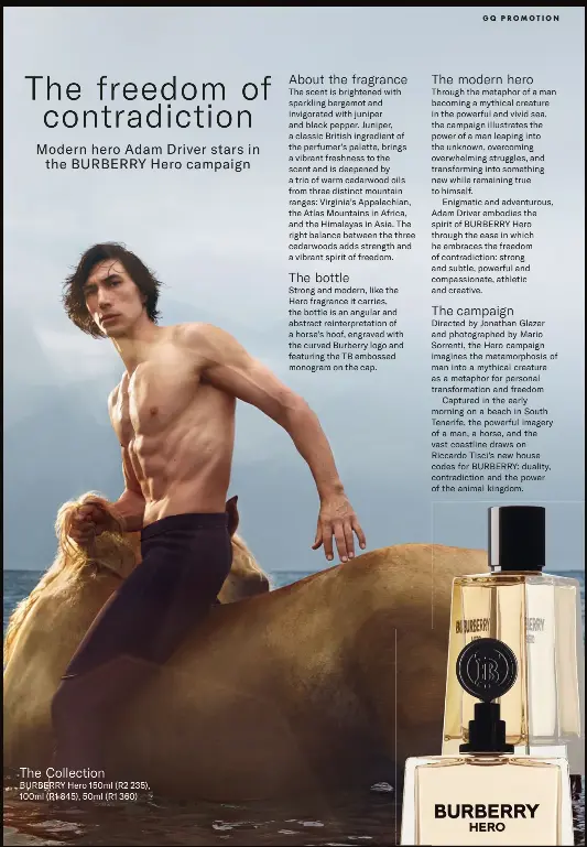 . Adam Driver 37 put his buff physique on display as he transformed into a centaur for an amazingly insane new ad for Burberrys latest fragrance. Burberry Hero Eau de Parfum presents a man on a journey to self-discovery. Once again the handsome actor removed his shirt for the sexy.